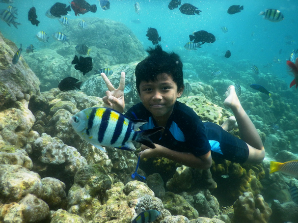 Lucunya, berbagai ikan dengan bentuk dan warnanya seperti tidak takut dengan manusia, malahan terlihat ingin bermain dan bercanda degan wisatawan yang sedang snorkling. Beberapa orang terlihat membawa mie dan roti untuk diberikan kepada ikan, agar ikan datang dan berkumpul. Berbagai jenis ikan disini diantaranya adalah ikan kepe-kepe, Botana Biru, Lion Fish, Angel Fish, Bintang laut sampai dengan karang-karang yang berbentuk motif batik.