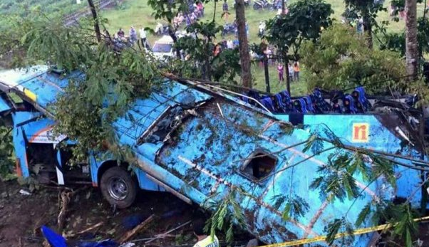 Bus tersebut masuk ke jurang dan mengalami kerusakan cukup parah.