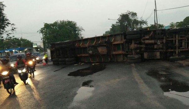 Naas, diduga over muatan truk yang dikemudikan Juli Nurwiyoto warga Jember, ini terguling sekitar pukul 05.00 WIB, Rabu (19/2017). Beruntung, tidak ada korban jiwa dan kondisi sopir selamat.