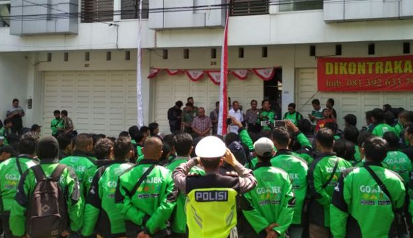 Tidak kurang 150 pengemudi ojek online berjaket hijau itu memadati kantor mereka sejak pagi sebelum petugas Satpol PP datang. Kedatangan mereka sebagai aksi solidaritas terhadap perusahaan tempat mereka mengais rejeki.