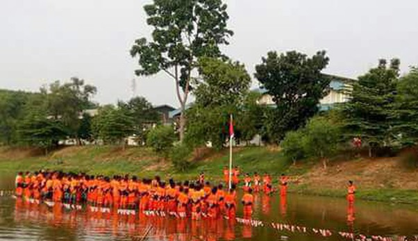 Pasukan oranye Kecamatan Cakung gelar upacara di tengah waduk |