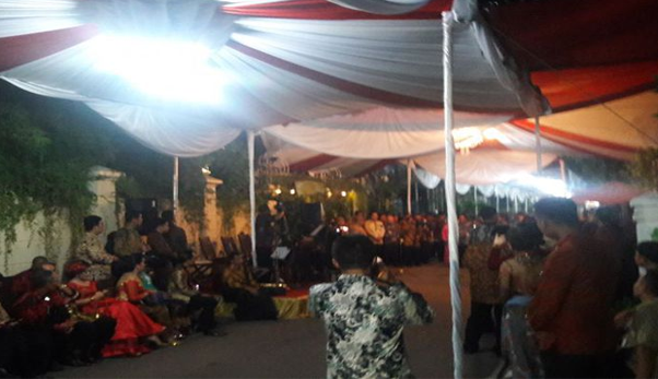 Pukul 19.10 WIB, acara Midodareni sudah berlangsung. Presiden Joko Widodo selaku tuan rumah sempat menyampaikan sambutan di depan relawan. Sambutan itu disambut meriah oleh para relawan. (kom.c/mega)