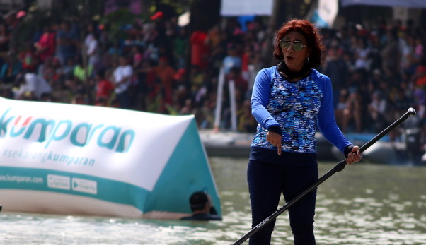 Susi yang paddling sepanjang 1 kilometer lebih dulu mencapai garis finish dibandingkan Sandiaga yang berenang.