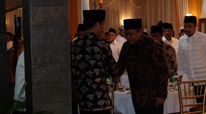 Setiba di lokasi, Jokowi bersalaman dengan Bamsoet selaku tuan rumah. Jokowi, JK, Bamsoet, hingga Ketua MPR Zulkifli Hasan duduk satu meja.