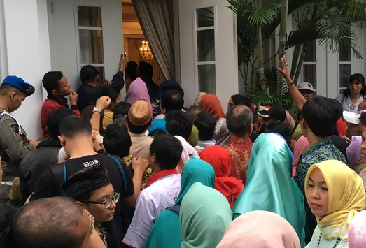 Pantauan detikcom di lokasi, Sabtu (23/6/2018), warga tampak antre untuk masuk ke rumah dinas Anies. Warga yang hadir sesekali berteriak agar antrean tertib dan tidak saling dorong.