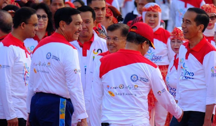 Pantauan di lokasi, Monas, Jakarta Pusat, Kamis (5/8/2018), senam selesai pukul 07.00 WIB. Dengan spontan, Jokowi dan para menteri hingga kepala lembaga saling salam-salaman satu dengan lainnya.