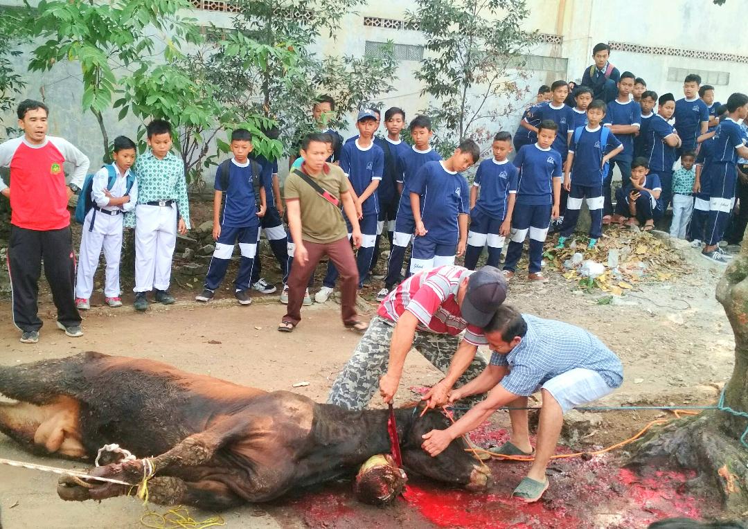 Selama pemotongan hewan qurban berupa 2 ekor sapi ini, para guru beserta para siswa mengumandangkan takbir hingga acara selesai.