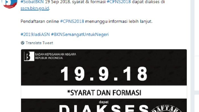 Demikian pengumuman yang disampaikan BKN melalui akun twitter resminya Senin (17/9/2018).