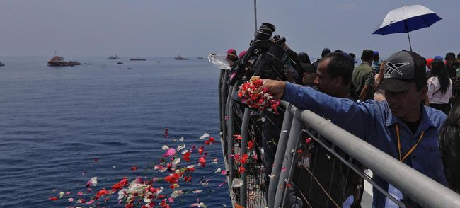 Setelah melihat lokasi jatuhnya pesawat, salah seorang operator dari pengeras suara mempersilakan kepada keluarga korban untuk menabur bunga di perairan Tanjung Karawang.