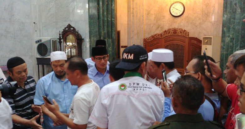 Sandiaga juga menyalami anggota jemaah di masjid dan meladeni permintaan foto bersama. Jemaah tampak memakai kemeja kerah berwarna biru yang merupakan outfit khas Sandiaga selama kampanye.