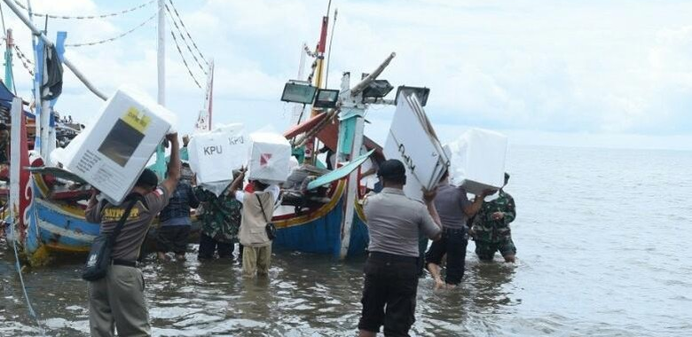 Situbondo , ToeNTAS.com,- Pengiriman logistik pemilu ke daerah terpencil di Situbondo dilakukan melalui jalur laut, Selasa (16/4/2019). Petugas terpaksa menyewa dua perahu nelayan untuk distribusi logistik pemilu ke 3 TPS di Dusun Merak Desa Sumberwaru, Kecamatan Banyuputih.