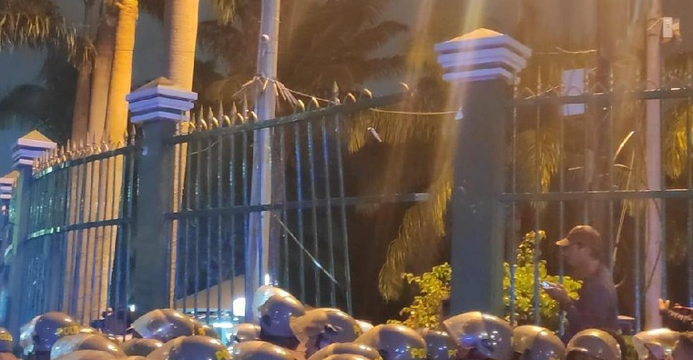 Pantauan di lokasi pukul 21.30 WIB, mahasiswa masih bertahan di sekitar depan gedung DPR, tepatnya di pagar yang sempat dijebol. Pagar ini juga dijaga polisi.