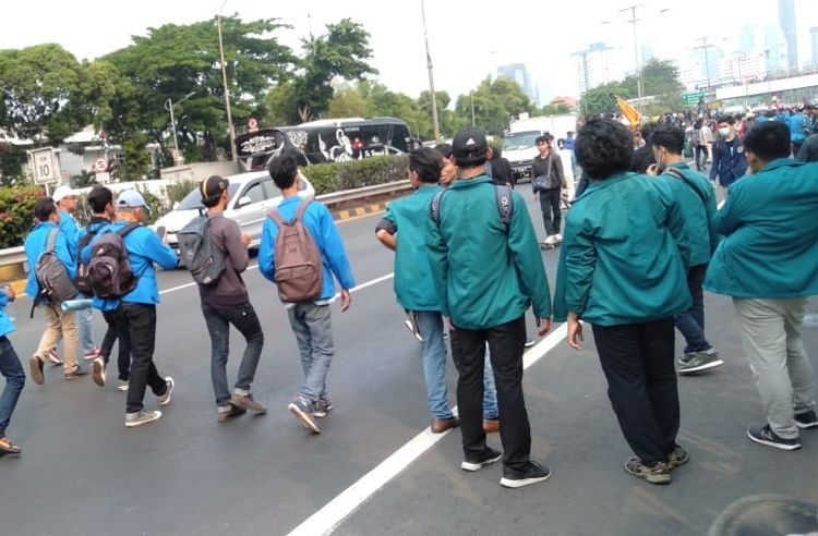 JAKARTA, ToeNTAS.com,- Sejumlah mahasiswa yang melakukan aksi demonstrasi di depan Gedung DPR RI mencoba memblokade jalan Tol Gatot Subroto, Jakarta Pusat, Selasa (24/9/2019). Mahasiswa yang semula melakukan aksi di depan Gedung DPR RI memanjat pembatas jalan setinggi tiga meter untuk masuk ke jalur tol. Mereka terlihat menghalangi beberapa mobil yang tengah lewat di jalur tol.