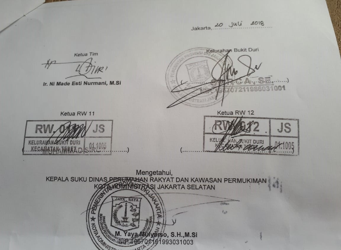 Disamping itu Rendy mengatakan, bahwa usulan Warga setempat juga telah dimasukan dalam program peningkatan kualitas kawasan permukiman Kel. Bukit Duri, dan dalam pertemuan 20 juli th 2018 antara Warga setempat dengan Sudin PRKP di Kantor Kelurahan Bukit Duri menghasilkan beberapa keputusan, seperti; 1. Warga menyetujui adanya pengecoran jalan beton di RW 11 dan RW 12, 2. Warga menyetujui adanya penyediaan Penerangan Jalan Umum (PJU) di RW 11 dan RW 12, 3. Warga menyetujui adanya perbaikan saluran drainase di RW 11 dan RW 12, 4. Warga menyetujui adanya penyediaan sarana bak sampah di RW 11 dan RW 12, 5. Warga menyetujui adanya penyediaan Alat Pemadam Api Ringan (APAR) di RW 11 dan RW 12, 6. Warga menyetujui adanya penyediaan Tanaman Obat Keluarga (TOGA) di RW 11 dan RW 12, 7. Warga RW 11 menyetujui adanya perbaikan lapangan bulu tangkis di RT 5, 8. Warga RW 12 menyetujui adanya pembangunan pintu gerbang di RT 12, RT 13, dan RT 14, 9. Warga RW 12 menyetujui adanya pembangunan taman vertikal di RT 13 dan RT 14.