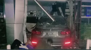 Sebuah mobil sedan BMW bernomor polisi B 610 MAG yang diduga tengah melaju dengan kecepatan tinggi dari arah Gunawarman tiba-tiba menabrak Apotek Senopati sekitar pukul 05.00 WIB.