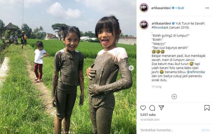 “Belajar menanam padi, ikut membajak sawah, main di lumpurr..seruu!,”tulis Artika dalam keterangan video yang ia unggah.