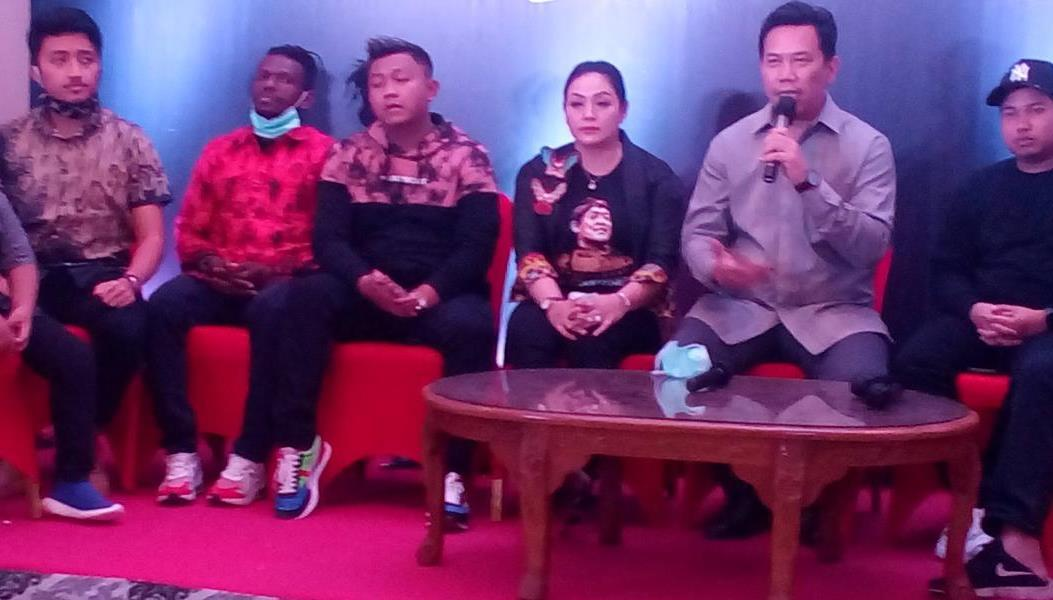Dian Eka Yanto (memegang mike), setika memberikan keterangan pers bersama pendukung konser ‘Ambyar Tak Jogeti Tribute to Didik Kempot’ di GBK November nanti.